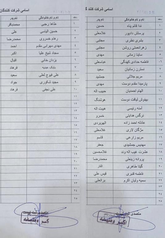 از مهارت آموزان مندرج در لیست دعوت می شود جهت شرکت در آزمون شهری در تاریخ مندرج در لیست به محل آزمون واقع در فاز 4 میدان مدافع حرم (لوکیشن در کانال تلگرام) مراجعه نمایند.